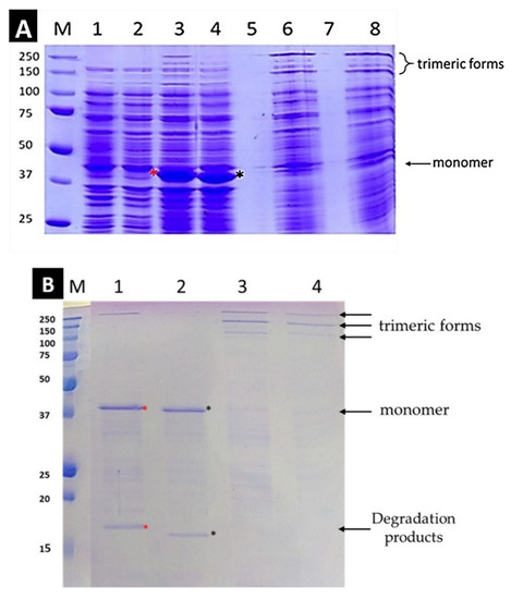 The following are available online at https://www.mdpi.com/article/10.3390/biom12020308/s1, Methods: “Native” SDS-PAGE and trimerization assessment; Figure S1: Representation of the protein migration states in SDS gels; Figure S2: The role of SDS percentage in loading buffer and the gel running temperature in the protein conformational state; Figure S3: SDS-PAGE (7.5%) of the cell lysates and inclusion bodies washes. Figure S4: Purification of proteins with a Q-sepharose column. Figure S5: Densitometric analysis of the Coomassie gels used for blot studies following chymotrypsin digestion.