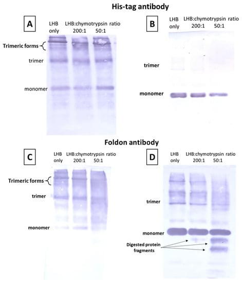 Chymotrypsin digestion experiments followed by electrophoresis and Western blot. The samples were electrophoresed and then probed with the His-tag antibody (A,B) and with the fibritin foldon antibody (C,D). In (A,C), unboiled samples were electrophoresed in the cold room; in (B,D) the samples were electrophoresed at RT after boiling at 100 °C for 5 min. Anti-His antibody detects the full-length protein and fragments that have an intact N-terminal end. Anti-foldon antibody detects the full-length protein and fragments that have an intact C-terminal end. LHB protein (0.2 mg/mL) was incubated with chymotrypsin for 10 min in various molar ratios (no chymotrypsin, 200:1, 50:1). Treated samples were subsequently frozen in 2% SDS loading buffer to quench the action of chymotrypsin.