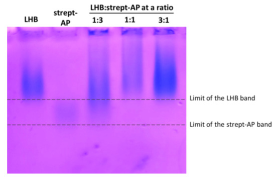 The biotinylated LHB protein is interacting with the streptavidin–alkaline phosphatase (strept-AP) and the streptavidin–horseradish peroxidase (strept-HRP) conjugates through the biotin–streptavidin non-covalent bond. Samples of various ratios of LHB:strept-AP or LHB:strept-HRP (1:3, 1:1, 3:1) were incubated for 2 h at RT. LHB had a fixed concentration at 0.4 mg/mL. The optimal binding ability was verified in a 1% agarose gel with the addition of a native protein sample buffer (without SDS). The gel was run in the cold room at 65 V.