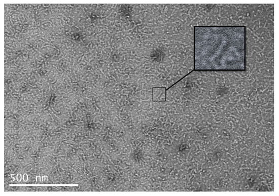 TEM picture of the LHB protein after purification, dialysis and negative staining. The insert points to one of the “straight” observed nanorods.