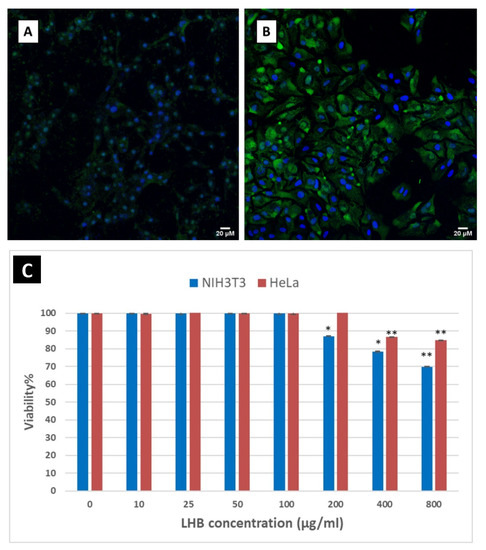 Intracellular delivery of LHB protein bound with NHS-Fluorescein (green) as a fluorescent tracker. (A) NIH3T3 cells and (B) HeLa cells. The nuclei are stained with DAPI (blue). Scale bar: 20 μm (C) MTT cell viability assay results of the LHB protein carrier incubated for 48 h in NIH3T3 and HeLa cells. Protein concentrations used varied from 10 to 800 µg/mL. Results are expressed as a percentage value of control cells cultured without the addition of the protein (control = 100%). Asterisks denote the significant difference in cell viability between the untreated cells and the transfected cells with the protein * is for p < 0.05 and ** for p < 0.01.