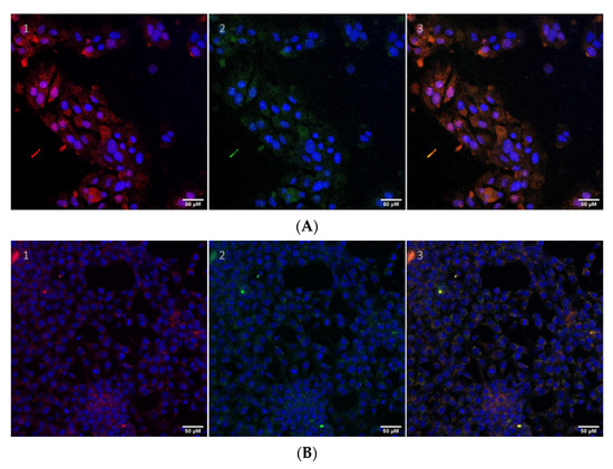 The LHB protein is attached to AlexaFluor®594 streptavidin Nanogold® by the means of the biotin-streptavidin strong non-covalent bond. Cell internalization studies of the LHB protein-streptavidin gold NP conjugate in HeLa (A) and NIH3T3 (B) cells are shown. The protein construct is labeled with NHS-fluorescein (green) and further to the streptavidin-gold NP which contains an exposed Alexa595 dye (red). Cell nuclei are stained with DAPI (blue). Z-stack measurements of the cells were also obtained to ensure that the protein conjugates localize inside the cells at the same level. (1) Only the nuclei (blue) and the AlexaFluor594 (red) filters are applied in the confocal microscope. (2) Only the nuclei (blue) and the fluorescein (green) filters are active. (3) All filters are applied and the green and red signals are co-localized mergings into a yellow–orange color, indicating the effective transport of the intact complex. Scale bar: 50 μm.