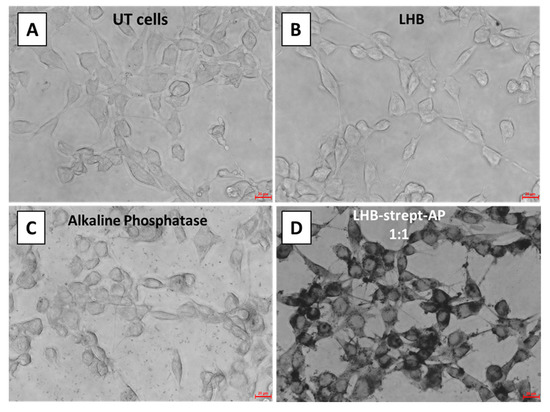 3.4.3. Localization of LHB Linked to Streptavidin–Alkaline Phosphatase Conjugate by BCIP-NBT Staining