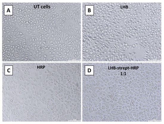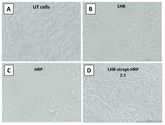 DAB staining of the HeLa cells after incubation at 37 °C and observation using an inverted microscope. (A) no addition (Untreated cells), (B) addition of the LHB protein only (C) HRP-streptavidin only, (D) addition of the LHB-streptavidin-HRP complex at 1:1 ratio. Scale bar: 100 μm.