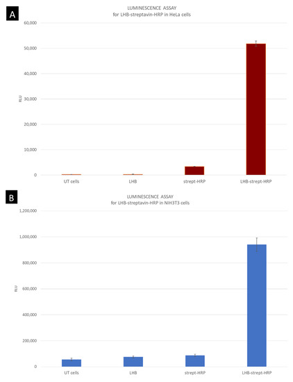 For the quantification of the enzymatic activity of HRP transfer into the cells mediated by LHB, a more sensitive method was used for the detection of the peroxidase activity. By using the Supersignal West Pico PLUS Chemiluminescent substrate kit the light produced was measured in a luminometer. The results demonstrate a significant difference in light intensity produced when cells were incubated with the streptavidin conjugated peroxidase enzyme and when the conjugate was carried inside the cells as a complex with LHB. For both cell lines, the enzymatic activity measured was significantly higher when cells were incubated with the LHB bound streptavidin-HRP in comparison to streptavidin-HRP only. The difference in intensity is 10× higher for the NIH3T3 cells when treated with the LHB-HRP conjugate in comparison with the streptavidin-HRP conjugate and the intensity levels are 16× higher in HeLa cells treated in the same way (Figure 13A,B). The formation of the streptavidin-HRP complex with the LHB protein significantly increases the peroxidase access to the interior of the cells. Moreover, it is proposed that this binding and transfer do not interfere with the structure and activity of peroxidase.
