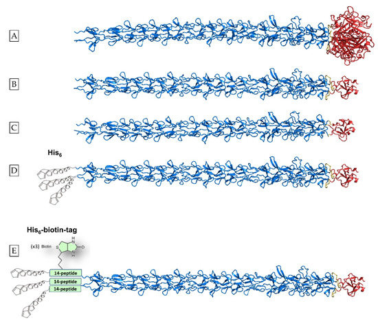 The purified proteins were analyzed by SDS-PAGE and Western Blot in order to detect the successful incorporation of His-tag sequences and biotin and for the distinction of the potential degradation products. For His-tag, the mouse Penta-His Antibody BSA-free (Qiagen) was used as primary antibody and for the biotin molecule, streptavidin conjugated with alkaline phosphatase (Sigma-Aldrich, St. Louis, MO, USA) was solely used for detection. Briefly, purified proteins were separated in a 7.5% SDS-PAGE and transferred to PVDF membranes. The membrane was blocked by mild shaking in 5% w/v skimmed milk in 1× phosphate-buffered saline (PBS) for 1 h at room temperature. After blocking, the PBS-milk was removed and the membrane was soaked in a solution of PBS-milk containing the primary antibody diluted 1:2000 and incubated overnight at 4 °C under mild shaking. After 3 washes by shaking for 15 min in a solution of 1× PBS with 0.04% Tween 20, the blots were incubated in PBS-milk containing the secondary antibody (anti-mouse IgG-alkaline phosphatase) diluted 20,000-fold for 2 h at room temperature under mild shaking. Three washes followed and the protein bands were visualized with the addition of 176 μL/10 mL NBT-BCIP substrate (Sigma) in alkaline phosphatase buffer (0.1 M Tris-HCl pH: 9, 0.1 M NaCl, 5 mM MgCl2). The same methodology was used for the detection of the fibritin foldon motif. The T4 fibritin anti-wac Antibody (Cusabio) was used as the primary antibody at the ratio of 1:1000 and anti-rabbit IgG conjugated with alkaline phosphatase as a secondary antibody at a ratio of 1:20,000. For biotin detection, the blot was incubated with streptavidin conjugated with alkaline phosphatase for 1 h at room temperature and was subsequently washed with PBS-Tween20. Following a rapid wash with alkaline phosphatase buffer, the chemiluminescent detection was performed with the addition of the BCIP-NBT substrate. The reaction was stopped by rinsing and substituting the reaction buffer with distilled water.