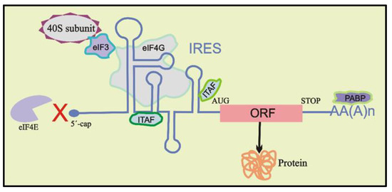 Schematic representation of cap-independent translation. Stem–loop secondary structures within the IRES in 5′ UTR may recruit the 40S ribosomal subunit directly to the start codon (AUG) of the open reading frame (ORF) or its vicinity through direct or indirect interactions, requiring the aid of certain canonical initiation factors (eIFs) and/or IRES trans-acting factors (ITAFs).