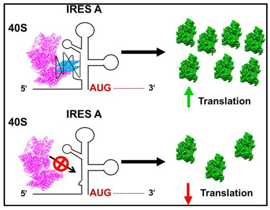 The initiation of protein synthesis in eukaryotes needs the recruitment of the 40S ribosomal subunit to eventually recognize the start codon (AUG) for translation of the mRNA [105,106,107]. Canonical eukaryotic cap-dependent translation initiation incorporates a complex mechanism for the recruitment and positioning of ribosomes at the start sites, during which, many factors interact with the ribosome [106,108,109]. Alternatively, several viruses and some eukaryotic mRNAs use a cap-independent pathway through highly structured IRES sequences present in the 5′ UTR of mRNAs, which drives pre-initiation complex formation by either positioning the ribosome on or just upstream of the translation start site [66,88,110] (Figure 2). Several studies have shown that GQ structures reside in proximity to the IRES element in 5′ UTR of mRNAs and modulate IRES activity [21,70,71,73,79]. For example, the presence of a switchable GQ structure in the IRES-A of human vascular growth factor (hVEGF) mRNA was deemed to be essential for optimum cap-independent translation initiation [21]. To identify the exact role of GQ in IRES-A-mediated translation initiation of hVEGF, we utilized structure mapping analyses [79]. Our findings indicated that a 17-nucleotide independently folding RNA GQ domain within the 294-nucleotide IRES-A interacted directly with the 40S ribosomal subunit without the aid of other protein factors (Figure 3). In addition, we showed that the GQ-forming domain particularly dictates the function and binding affinity of IRES-A towards the 40S subunit compared with the bacterial 30S subunit. Further, we proved that GQ domain deletion hindered the 40S subunit from binding to the IRES and deteriorated cap-independent translation initiation, indicating the necessity of the GQ structure in IRES function. Similarly, Marques-Ramos et al. [73] also demonstrated the direct binding interactions of GC-rich secondary structures of mTOR 5′ UTR with the 40S ribosomal subunit without the involvement of any initiation factors. They revealed that the mTOR 5′ UTR binds to the ribosomal subunit with a similar binding affinity to the CFSV viral IRES by using a filter binding assay.