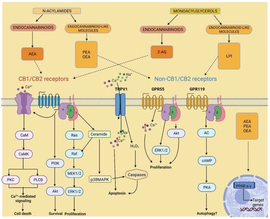 Since the discovery of the ECS and its potential benefits in disease treatment, a significant amount of attention was invested in understanding the roles of ECS signalling in the body. Over time, various research in cannabinoids’ mechanisms of action, synthesis and catabolism provided evidence to suggest that there are many additional cannabinoid analogues, receptors and enzymes associated with this system (Figure 2). Indeed, the agonists AEA and 2-AG showed an affinity for receptors other than CB1 and CB2 [26,27,28], including the G protein-coupled receptor 55 (GPR55) [29], the transient receptor potential vanilloid subtype 1 (TRPV1) [30], and the peroxisome proliferator-activated receptors (PPARs) [31].