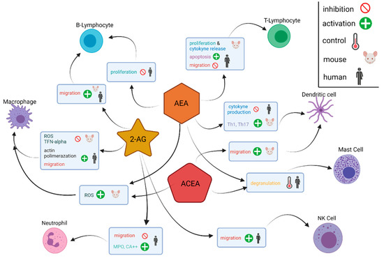 Diagram depiction of the molecular effects of the cannabinoids AEA, ACEA and 2-AG on different immune cells. Immune cells within the tumour microenvironment express receptors of the endocannabinoidome and release endocannabinoids and endocannabinoid-like molecules. Arachidonyl-2’-chloroethylamide, ACEA; anandamide, AEA; 2-arachidonoylglycerol, 2-AG; myeloperoxidase, MPO; reactive oxygen species, ROS; T helper 1 cells, Th1; T helper 17 cells, Th17; tumour necrosis factor-alpha, TNF-alpha.