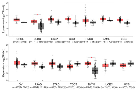 - Tang, Z.; Li, C.; Kang, B.; Gao, G.; Zhang, Z. GEPIA: A web server for cancer and normal gene expression profiling and interactive analyses. Nucleic Acids Res. 2017, 45, W98–W102. [Google Scholar] [CrossRef] [PubMed]