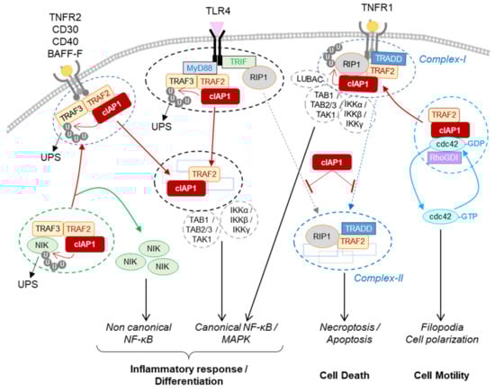 cIAP1 and its paralogous cIAP2 are most studied for their ability to regulate innate immunity and inflammation [12]. By controlling the scaffolding and kinase activities of RIPK1, cIAPs dictate the response of cells to tumor necrosis factor receptor (TNFR) superfamily stimulation [13]. They have also been involved in the control of the inflammatory response mediated by pattern recognition (PRRs) and cytokine receptors [14]. In addition, cIAP1 can control intracellular signaling pathways that drive cell motility and migration, regulate cell cycle cell proliferation and transcriptional programs [15].