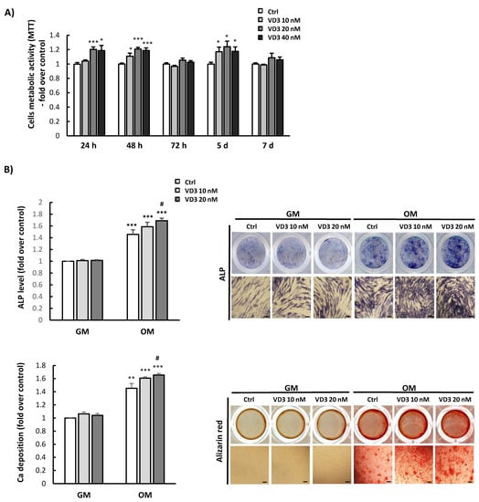 Influence of VD3 on BM-MSCs’ proliferation and differentiation: (A) Viability/metabolic activity of cells treated with VD3 (10 nM, 20 nM, or 40 nM) for 24 h, 48 h, 72 h, 5 days, and 7 days, as estimated by MTT assay. Results are presented as the mean ± SEM from at least three independent experiments. Statistically significant differences in comparison to untreated controls (Ctrl): * p < 0.05; *** p < 0.001. (B) Osteogenesis of BM-MSCs was analyzed for cells grown in growth medium (GM) or osteogenic medium (OM), with or without VD3 (10 nM or 20 nM). After 7 days, ALP activity was determined by histochemical staining, while calcium depositions were stained after 21 days with Alizarin Red. Representative images are shown (scale bars: 50 µm). Graphs represent quantitative analysis of ALP activity and mineralization levels for at least three independent experiments. Results are normalized to values for untreated controls and presented as means ± SEM. Statistically significant differences: ** p < 0.01; *** p < 0.001 compared to untreated GM controls; # p < 0.05 compared to untreated OM controls.
