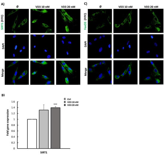 To evaluate the mechanism underlying VD3-mediated effects on BM-MSCs, we analyzed how VD3 affected SIRT1-FoxO3 signaling pathways in BM-MSCs following the 5-day treatment period. For that purpose, immunofluorescent staining was performed, revealing constitutive protein expression of both SIRT1 and FoxO3—predominantly localized in the cytoplasm of the tested cells. After 5 days of treatment with both concentrations of VD3 (10 nM and 20 nM), our results demonstrated markedly stimulated expression of SIRT1 not only in the cytoplasm of BM-MSCs, but in the nuclear region as well (Figure 3A). Similarly, after 5 days of treatment with VD3 at both concentrations, protein expression of FoxO3 in BM-MSCs was increased—mainly in their cytoplasmic region. Moreover, to a certain extent, treatment with VD3 at 20 nM also increased FoxO3 expression in the perinuclear region of BM-MSCs (Figure 3C). In agreement with the results of immunofluorescent staining, qPCR analysis revealed elevated levels of SIRT1 mRNA expression in BM-MSCs following 5-day incubation with VD3. Statistically significantly higher expression of the SIRT1 gene was observed at 20 nM VD3 in comparison to untreated controls (Figure 3B).