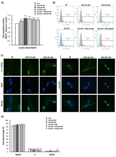 As stimulated BM-MSCs’ viability in the presence of VD3 was detected by MTT within a 5-day treatment period, we further intended to estimate the involvement of SIRT1 signaling in this process by using a selective inhibitor of SIRT1: EX-527. After the 5-day treatment, this pharmacological inhibitor successfully reduced the expression of the SIRT1 protein in BM-MSCs at 5 μM concentration (Figure S2) and, at the same time, stimulated the viability of BM-MSCs as determined by MTT (Figure 4A). However, the high metabolic activity of BM-MSCs induced by both EX-527 and VD3 treatment (Figure 4A) indicated that the stimulatory effect of VD3 on BM-MSCs’ viability is SIRT1-independent. In line with the MTT test, results of expression analysis for the proliferation marker Ki67 showed a similar influence of VD3 and EX-527. Specifically, the 5-day treatment of BM-MSCs with VD3 increased the percentage of Ki67-positive cells—particularly in the presence of higher VD3 concentrations (Figure 4B). However, an increased proportion of Ki67-positive cells was also observed upon EX-527 treatment, and it was additionally stimulated when applied together with 20 nM VD3 (Figure 4B). Immunofluorescence analyses of Ki67 expression demonstrated increased nuclear expression of this marker in VD3-treated BM-MSCs (Figure 4C), whereby the presence of EX-527 did not change this effect (Figure 4C). Moreover, analysis of cell cycle progression revealed that the treatment with 20 nM VD3 slightly reduced the percentage of BM-MSCs in the S phase, while in parallel it increased their percentage in the G2/M phase (Figure 4D). Again, this effect was not changed in the presence of EX-527. Collectively, these findings indicate that VD3 can influence BM-MSC proliferation, and that this effect does not depend on the activation of SIRT1 signaling in these cells.