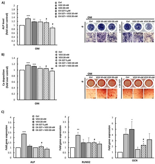 Stimulated osteogenic differentiation of VD3-pretreated BM-MSCs: involvement of SIRT1 signaling: BM-MSCs were pretreated for 5 days with VD3 (10 nM or 20 nM), EX-527 (5 µM), or both, in GM. Afterwards, the cells were cultured in OM for the appropriate period to induce osteogenesis. (A) ALP activity detected after 7 days of cultivation in OM by histochemical staining. (B) Calcium depositions stained with Alizarin Red after 21 days. Representative images are shown (scale bars: 50 µm). Graphs represent quantitative analysis of (A) ALP activity and (B) mineralization level for at least three independent experiments. Results are normalized to values for untreated controls and presented as means ± SEM. Statistically significant differences: ** p < 0.01; *** p < 0.001 compared to untreated OM controls; # p < 0.05, ## p < 0.01 compared to corresponding pretreatment with VD3 in the absence of EX-527. (C) For quantitative real-time PCR analysis of the ALP, RUNX2, and OCN mRNA expression, cells were grown for 5 days in GM in the presence of VD3 (10 nM or 20 nM), EX-527 (5 µM), or both. Relative expression levels for ALP, RUNX2, and OCN genes were normalized to the Ct value of the housekeeping gene GAPDH. Calculations by the 2−ΔΔCT method are presented as the mean ± SEM from at least two independent experiments. Statistically significant differences: * p < 0.05; ** p < 0.01; *** p < 0.001 compared to untreated controls; # p < 0.05 compared to corresponding VD3 treatment without EX-527.