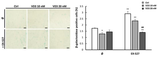 Additional experiments were conducted with the aim to evaluate the impact of VD3 treatment on cellular aging (senescence) of BM-MSCs, as well as the potential involvement of SIRT1 in VD3-mediated effects. For this purpose, the expression of the senescence marker β-galactosidase was analyzed in BM-MSCs after 5-day treatment with VD3 (10 nM or 20 nM), EX-527 (5 µM) or both. Results demonstrated a lower percentage of β-galactosidase-positive cells in VD3-treated BM-MSCs, reaching statistical significance when 10 nM VD3 was applied (Figure 7). As expected, inhibition of SIRT1 by EX-527 resulted in an increased level of β-galactosidase-positive cells, in accordance with the protective role of SIRT1 in cellular senescence (Figure 7). However, when combined with VD3, the senescence-promoting activity of EX-527 on BM-MSCs was attenuated, as demonstrated by a lower proportion of β-galactosidase-expressing cells—particularly when 20 nM VD3 was used. These results imply that VD3 treatment might potentially delay the replicative senescence of BM-MSCs, independently of SIRT1 signaling.
