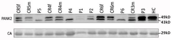 Abundance of PANK2 protein in erythrocytes of patients affected by PKAN and disease carriers. Hemoglobin-depleted cytosolic extracts were resolved by SDS PAGE and analyzed by Western blotting on a nitrocellulose membrane using a polyclonal rabbit anti-PANK2 antibody. Carbonic anhydrase (CA) was detected by a rabbit monoclonal antibody and served as loading control to assess the specific abundance of the PANK2 protein. HC refers to a sample obtained from a healthy control donor used for normalization to calculate the relative abundance of PANK2 in the patient and carrier samples.