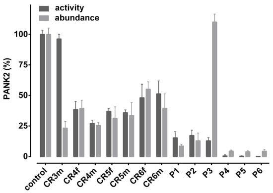 PANK2 activities and abundances in erythrocyte of PKAN patients and carriers. Erythrocyte cytosolic extracts of a healthy donor (control), carriers (CR3-CR6 (f/m denotes father or mother of respective patient)), and PKAN patients (P1–P6) were assayed by radiometry for phospho-pantothenate generation described in Section 2. Specific PANK2 activities per total protein were determined and relative PANK2 activities were calculated from the specific activities by normalization to the specific activity of the control donor. Erythrocyte cytosolic extracts of the same set of blood samples were depleted of hemoglobin concentrated and analyzed by SDS PAGE and Western blotting for the abundance of PANK2 protein as described in Section 2. Specific PANK2 abundances were determined in relation to carbonic anhydrase and relative PANK2 abundances were again calculated by normalization to that of the control donor. All values are mean values (n = 3) given in relative percent plus/minus standard deviations (stdev.).