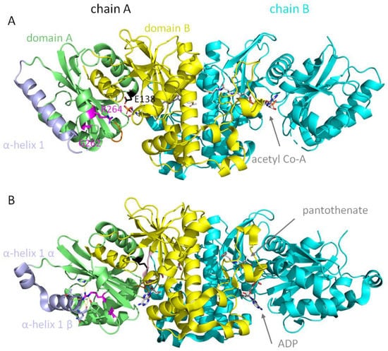 PANK proteins are highly cooperative allosteric enzymes that exploit structural changes at the dimer interface to coordinately switch between active and inactive conformations [22]. To illustrate this conformational change, PANK3 with acetyl-CoA (PDB 3mk6) representing the inactive “open” conformation and PANK2 structure in complex with pantothenate and adenosine diphosphate (PDB 5e26) representing the active “closed” conformation were taken. The catalytic core of the different PANK isoforms is highly conserved indicating a common catalytic mechanism of all isoforms. Figures of protein structures were created using pymol (https://pymol.org/2/, accessed on 25 November 2021).