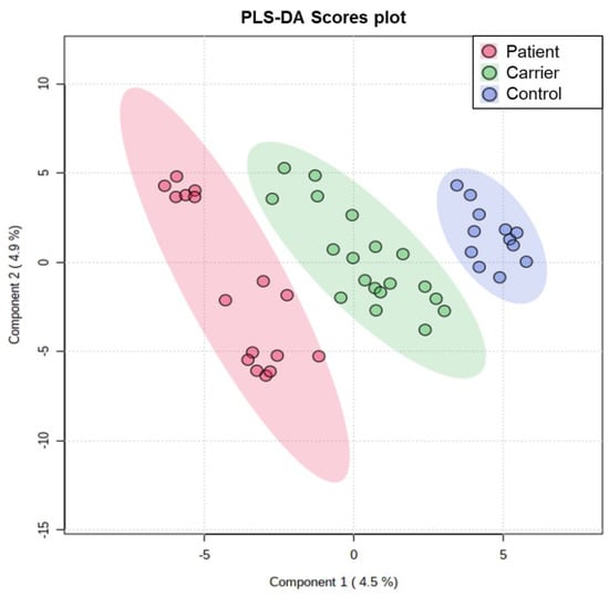 Processed data were analyzed by performing multivariate and univariate analyses. Principal component analysis (PCA) and partial least squares-discriminant analysis (PLS-DA) were carried out using MetaboAnalyst [20,21]. The key mass ions representing potential characteristic metabolites were determined based on variable importance in projection (VIP) values obtained from two-way orthogonal comparisons. Mass ions with VIP values greater than one were considered as discriminant key characteristic metabolites. Univariate analyses were performed in parallel to multivariate analyses to identify significant mass ions. One-way Anova with Tukeys HSD post hoc test and false discovery rate (FDR, cut-off ≤ 0.05) correction was performed using MetaboAnalyst to determine the significantly changed mass ions between control, carrier, and patient groups. MetaboAnalayst and the Kyoto Encyclopedia of Genes and Genomes (KEGG) database were used to analyze and visualize the affected pathways.