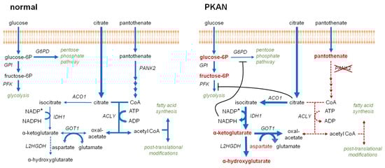Pathway model of a potential citrate shunt in PKAN erythrocytes. In erythrocytes, citrate imported from the plasma is the only source for the acetyl moiety in acetyl-CoA, which is the primary building block for fatty acid synthesis and essential for post-translational modifications. Its formation is mediated by ACLY under consumption of ATP and citrate. Depletion of CoA largely impairs this reaction in PKAN erythrocytes. An alternative citrate pathway via ACO1 and IDH1 is preferably active in PKAN erythrocytes since metabolites of this route were found to be altered accordingly. Metabolites with normal abundances are in black, pathways are in italic green font. Altered metabolites are shown in red, normal font indicates decreased and bold fonts increased levels. Pathways that are strongly affected in PKAN erythrocytes are indicated with dotted lines and arrow heads in red. The red cross indicates absent/inactive PANK2 protein due to the genetic condition. Black arcs indicate potential inhibition of G6PD by elevated NADPH/NADP+ ratios and of PFK by increased citrate and ATP levels. The following enzyme acronyms are used: aconitate hydratase (ACO1), isocitrate dehydrogenase (IDH1), aspartate-aminotransferase (GOT1), ATP-citrate synthase (ACLY), α-hydroxyglutarate dehydrogenase (L2HGDH), glucose-6-phosphate isomerase (GPI), glucose-6-phosphate dehydrogenase (G6PD), phosphofructokinase (PFK), and pantothenate kinase 2 (PANK2).