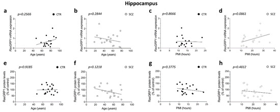 3.3. Lack of Correlation between RasGRP1 mRNA and Protein Levels with Age and PMI in the Hippocampus of Schizophrenia Patients