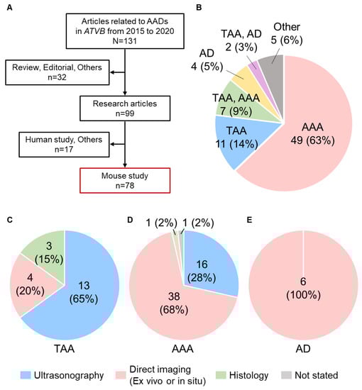 Difference of the primary imaging approach in mouse studies for aortic diseases published in Arteriosclerosis, Thrombosis, and Vascular Biology (ATVB) from 2015 to 2020. (A) Schematic diagram for included or excluded articles in this review. (B) The number of articles of aortic studies published in ATVB from 2015 to 2020. Primary imaging approaches for the evaluation of (C) TAA, (D) AAA, and (E) AD.