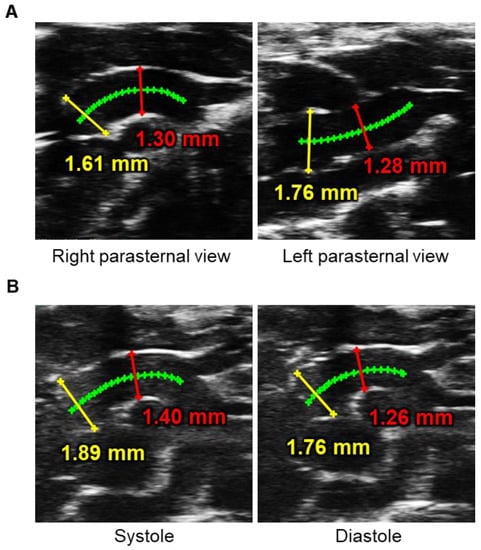 Impacts of ultrasound view and cardiac phase on measurements of aortic diameters in mice. (A) Representative ultrasound images of right and left parasternal long-axis approaches in the proximal thoracic aorta. (B) Luminal diameters at the aortic root (yellow) and ascending aortic (red) were measured at the mid-systole and end-diastole in the right parasternal long-axis view. Green lines placed on the center of aortic lumen were used as a reference for aortic measurements. Authors’ unpublished data. Ultrasound images were captured by Vevo 3100 with an MX550D (40 MHz).