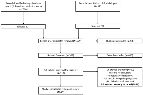 The PRISMA guidelines were used in the implementation of the entire literature review process [25]. Figure 1 shows a flow diagram reporting the number of in- and excluded studies and the reason for exclusion. For the meta-analysis, categorical data were summarized as numbers or percentages. A random effects meta-analysis was used to calculate overall proportions and corresponding 95% confidence intervals. Studies with a control arm were included in a comparative random effects meta-analysis. Risk ratios and 95% confidence intervals are reported. For rare outcomes (such as serious adverse events), risk differences were used as effect measure instead, as risk ratios cannot be computed when no events are observed in the and control arm. All analyses were performed in R version 3.6 or higher.