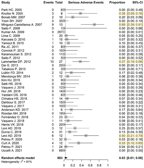 Out of the 70 studies, 39, including 10 controlled trials, reported adequate safety data involving the proportion of patients experiencing SAEs. In these, 53/883 patients on the experimental arms encountered SAEs, in 19 out of 39 studies. The overall frequency of SAEs was low: 0.03 (95% CI: 0.01–0.08). Five studies showed a significantly higher proportion of patients experiencing SAEs in comparison to the global effect of the studies (Figure 2). Forty studies were included in the calculation of the proportion of patients experiencing an SAE related to the cellular therapy or administration procedure. The overall incidence of related SAEs was low—0.02 (95% CI: 0.01–0.04)—and only one study by Minguez-Castellanos et al. [101] showed a significantly higher proportion of SAEs related to the administration regimen and/or cell product in comparison to the global effect of the studies (Appendix C).