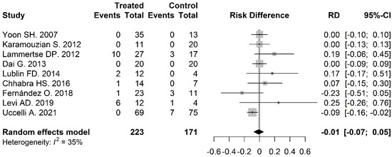 The incidence of SAEs was compared between intervention and control groups in nine of the studies and was 0.03 (95% CI: 0.01–0.20) and 0.06 (95% CI: 0.02–0.19), respectively. The risk difference for SAEs in intervention groups versus control groups was −0.01 (95% CI: −0.07–0.05) and was not significant p = 0.73 (Figure 3).