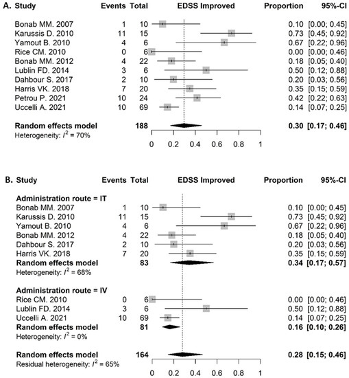 Ten studies reported adequate results of the EDSS status in MS patients. Out of 188 patients, 52 improved their EDSS in the experimental arm. The proportion of clinically improved patients after a 12-month follow up was 0.30 (95% CI: 0.17–0.46) (Figure 4A). No comparative analysis was done because only two studies were included and the analysis would therefore have no added value. The efficacy of two different administration routes, namely IT and IV, was compared by means of a subgroup difference test. The proportion of patients who improved their EDSS status in the IT group was 0.34 (95% CI: 0.17–0.57), whereas this proportion was lower in the IV group—0.16 (95% CI: 0.10–0.26). However, the result for the subgroup differences was not significant, χ2 = 3.11 and p = 0.078 (Figure 4B).