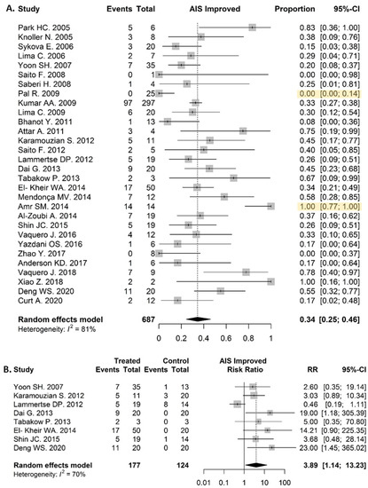 Thirty clinical trials with SCI patients were included in this analysis evaluating the proportion of patients who improved their AIS grade. Out of 687 SCI patients, 229 improved their AIS grade in the experimental arm, resulting in a proportion of clinical improved patients after a 6–12 month follow up of 0.35 (95% CI: 0.25–0.46) (Figure 5A). One study by Amr et al. showed a significantly higher proportion of improvement in comparison to the global effect of the studies, as all 14 patients changed their AIS grade [59]. On the other hand, one study showed significantly lower improvement in AIS grade, as 0 out of 25 patients showed clinical changes [105]. In addition, a risk-ratio analysis in eight studies, comparing the intervention and control group, was performed. The proportion of AIS-improved patients in the experimental group was remarkably higher (0.35 (95% CI: 0.27–0.44)) than in the control group (0.04 (95% CI: 0.01–0.22)). The calculated risk ratio was 3.89 (95% CI: 1.14–13.23, p = 0.030) (Figure 5B).