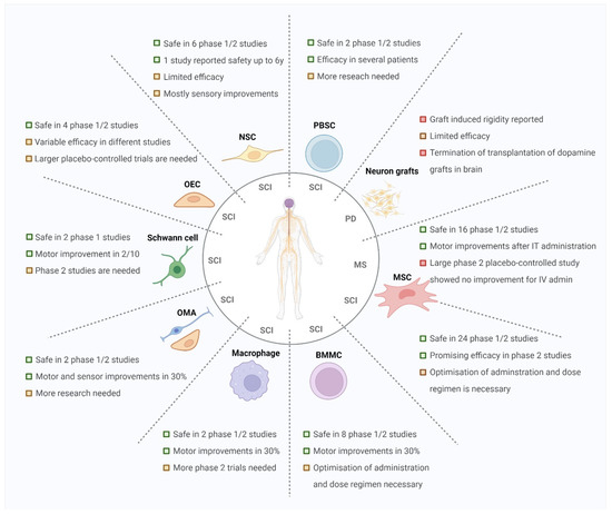 Our analyses showed that cellular-based therapies are safe and feasible and showed promising clinical improvements in several patients with MS and SCI (Figure 6). However, taking into account the failure of NECTAR studies in PD patients in the past, extensive research into the exact mechanism of action, functionality, and survival of the administered cells, combinations of different therapeutic strategies, administration routes and dose regimens is still needed to successfully develop a regenerative cell-based therapy for neurodegenerative diseases.