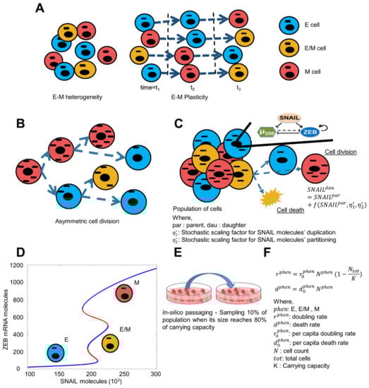 Here, we have developed a population dynamics framework to explain the emergence of epithelial-mesenchymal heterogeneity in a given population, and the contribution of spontaneous state switching in enabling this heterogeneity (Figure 1A). Specifically, we consider phenotypic switching to occur during cell division (Figure 1B), where two factors can contribute to a daughter cell having a phenotype different than its parent cell: noise or fluctuations in (i) content duplication and that in (ii) partitioning of biomolecules, particularly in SNAIL (depicted by ) (Figure 1C). (For more information on formalism used to include content duplication and partitioning noise, please refer to Methods Section 2.1). Each cell contains the ZEB1/miR-200 feedback loop driven by SNAIL, and the levels of these molecules define the state of each cell. Depending on the levels of SNAIL, cells may acquire a phenotype among all the stable ones, as shown in the bifurcation diagram (Figure 1D) [22]. At SNAIL = 150 K molecules, all cells can adopt only an epithelial state (lower blue curve in Figure 1D); at SNAIL = 200 K molecules, a cell can acquire any of the three states—epithelial (E; lower blue curve), mesenchymal (M; top blue curve) or hybrid E/M (middle blue curve), while at SNAIL = 250 K molecules, all cells adopt a mesenchymal state (top blue curve in Figure 1D). Thus, asymmetry in content duplication and/or partitioning of SNAIL levels can alter the SNAIL values sufficiently enough to allow a phenotypic switch. For instance, if one daughter cell has SNAIL = 250 K for a parent cell with SNAIL = 200 K, then the daughter cell will be mesenchymal in nature irrespective of the phenotype of the parent cell (E, hybrid E/M or M). We have also implemented in silico passaging to mimic the experimental protocol for conducting these experiments, where 10% of the cell population is passaged maintaining the distribution of cells in different phenotypes when the entire population reaches 80% of its carrying capacity (Figure 1E). Further, the division rate of each subpopulation of cells is considered to follow the logistic growth rate, whereas the death rate is directly proportional to the subpopulation size (Figure 1F). Together, these factors are incorporated in a population dynamics model including cell division which may be accompanied by a phenotypic switch (please see Methods Section 2.2 and Section 2.3 for more details about the population dynamics model).