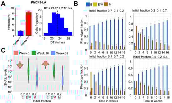 Using this framework, we investigated how the population distribution emerged over time as we started with different initial fractions, and whether we can recapitulate the dominance of epithelial (EpCAMhigh) subpopulation over a mesenchymal (EpCAMlow) one as seen experimentally (Figure 2A) [20]. We first experimentally quantified the doubling time of PMC42-LA cells to be 22.67 ± 2.77 h (Figure 2A). We started our simulations with four distinct initial conditions: (1) Epithelial dominated (initial fraction E:E/M:M = 0.7:0.1:0.2), (2) Mesenchymal dominated (initial fraction E:E/M:M = 0.2:0.1:0.7), Hybrid dominated (initial fraction E:E/M:M = 0.1:0.7:0.2), and mixed fractions (initial fraction E:E/M:M = 0.4:0.2:0.4). In these simulations, we considered an average doubling time of the population to be 20 h, η1 (scaling factor for noise due to SNAIL molecules’ duplication) = 0.2 and η2 (scaling factor for noise due to SNAIL molecules’ partitioning) = 0.1, and tracked the population distribution as a function of time. This choice of values represents typical coefficient of variance values in protein levels reported in human H1299 lung carcinoma cells [26].