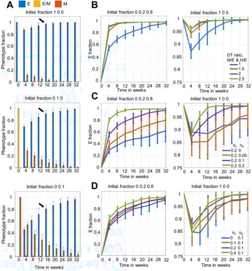 Besides initial phenotypic distribution, another factor that can impact the population dynamics is average doubling time (DT). So far, we considered the same DT for E, E/M, and M phenotypes. However, experimental evidence suggests the slowing down of proliferation rate of cells undergoing EMT [20,27]. Thus, we considered the case of increased DT during EMT, by keeping the average DT of E/M and M phenotypes as 1.5, 2, and 2.5 times more than that of the E phenotype. We observed that the population maintained its epithelial dominance, and converged to a stable phenotypic distribution faster than in the case when all cells doubled at the same rate (Figure 3B), irrespective of the initial condition. This trend can be explained by a higher resilience of E cells to switch to a hybrid E/M or M phenotype during cell division, now coupled with their higher proliferation rate, thereby offering the epithelial subpopulation an additional advantage to amplify their population fraction. Importantly, this trend was already seen at the DT of hybrid E/M and M cells being 1.5 times that of the E cells, hence indicating that a 50% increase in doubling time for cells undergoing EMT may be sufficient in influencing the population structure. The slight initial decrease in the epithelial fraction noticed for the purely E case (Figure 3A,B) can be explained by appreciating that SNAIL levels for the initial cell population were sampled from a log-normal distribution, whose median was centred on the SNAIL level where all phenotypes were stable (tristable region in Figure 1D); therefore, the cells were highly susceptible to undergo phenotypic switching within the first few cell divisions. Despite this initial dip, an epithelial dominant population emerged eventually.