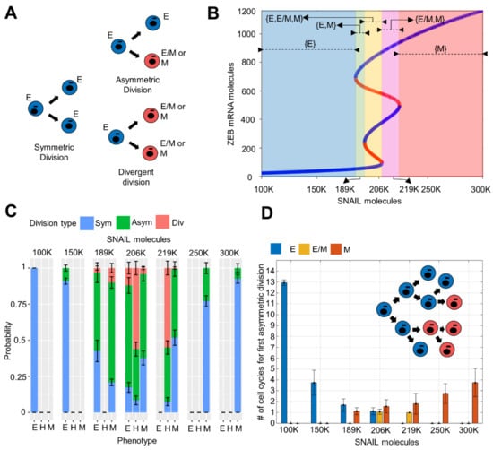 After characterising the population dynamics at various time points as a function of different model parameters, we wanted to better understand it from a cell division perspective. In our framework, a cell can undergo one of the three division types: (1) symmetric division—when both daughter cells have the same phenotype as the parent cell, (2) asymmetric division—when one daughter has a phenotype different than the parent, and (3) divergent division—when both daughters have a phenotype different than the parent (Figure 4A). To quantify the probability of cells undergoing one of the three division types, we analysed certain cells occupying possible stable phenotypes spread across the SNAIL ranges (Figure 4B). Iterating cell division events at a given SNAIL value, we tracked the phenotypes of daughter cells, at specific η1 and η2 values, thus calculating different division probabilities over an ensemble of iterations. At η1 = 0.2, η2 = 0.1, in SNAIL levels regions where either E or M phenotypes were the only stable state (monostable regions in bifurcation diagram—Figure 4B; SNAIL = 100 K, 300 K), more than 90% events were of symmetric division (Figure 4C). However, as the SNAIL levels corresponded to a multi-stable region (SNAIL values = 150 K, 250 K), there was an increasing tendency to undergo asymmetric division, which was higher for M than for E cells. In different bi-stable regions (SNAIL = 189 K for {E, M} and SNAIL = 219 K for {E/M, M}), with further increasing probability of asymmetric division, the divergent division also became more prominent and was the most dominant division for hybrid E/M cells (Figure 4C). This trend explains the sudden drop in hybrid E/M fraction of population to very low levels within two weeks, when starting from a hybrid dominant population (Figure 3A). Further, in the tri-stable region (SNAIL = 206 K for {E, E/M, M}), the probabilities for both divergent and asymmetric division were increased (Figure 4C). Put together, the probability of phenotypic switching at cell division is the highest in the tri-stable region (intermediate SNAIL levels ~200 K) and decreases for cells as their corresponding SNAIL levels either increase or decrease.