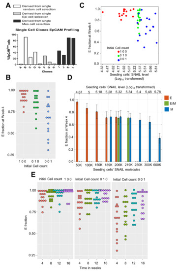 Heterogeneity in the E fraction among single cell clones at initial stages of culture. (A) Experimentally observed heterogeneity in EpCAM profiling of single cell clones from PMC42-LA cells (adapted from Bhatia et al. J Clin Med [20]). (B) Variability in the E fraction observed on simulating population dynamics starting with single E, E/M and M cell. Each dot represents the E fraction at 4th week in an independent single cell simulation run. (C) E fraction in a single cell clone at 4th week plotted against the seeding (parent) cells’ SNAIL level. (D) Spread of the E fraction at 4th week of single cells clones when the seeding cells were initialised with certain SNAIL levels spanning mono-, bi-, and tri-stable regions of bifurcation diagram (Figure 4B). Mean and standard deviation calculated from 20 independent runs (E) Temporal dynamics extension of single cell simulation runs in (B). All results are with η1 = 0.2 and η2 = 0.1, and DT(E, E/M, M) = 20 h.