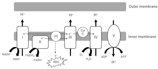 Electron transport chain (ETC) in mitochondrial inner membrane. NADH and FADH2 from the TCA cycle donate electrons to Complexes I and II. As electrons are transported through the ETC, a proton gradient is generated, which Complex V or ATP synthase couples to ATP synthesis. Electron leakage from the ETC causes the production of ROS. ADP, adenosine diphosphate; ATP, adenosine triphosphate; Cyt C, cytochrome complex; ROS, reactive oxygen species; UQ, ubiquinone; TCA cycle, tricarboxylic acid cycle.