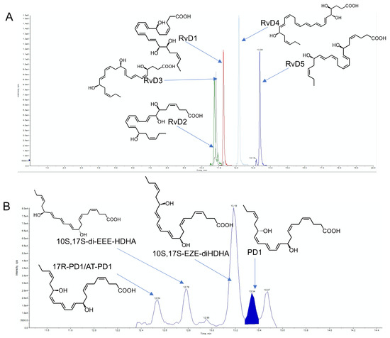 Separation of specialized pro-resolving mediators using Reverse Phase High Pressure Liquid Chromatography. Representative examples of (A) the chromatographic separation of DHA derived D-series resolvins demonstrating the separation of both di- and tri-hydroxylated species as well as positional isomers and (B) DHA-derived Protectins (PD) demonstrating the chromatographic separation of double bond and chiral isomers using RP-HPLC. Conditions employed in the separation and identification of these autacoids are as follows: samples were injected using a Shimadzu LC-20AD HPLC and a Shimadzu SIL-20AC autoinjector, paired with a QTrap 6500+ (Sciex). An Agilent Poroshell 120 EC-C18 column (100 mm × 4.6 mm × 2.7 µm) was kept at 50 °C and mediators eluted using a mobile phase consisting of methanol/water/acetic acid of 20:80:0.01 (v/v/v) that was ramped to 50:50:0.01 (v/v/v) over 0.5 min, then to 80:20:0.01 (v/v/v) from 2 min to 11 min, maintained until 14.5 min and then rapidly ramped to 98:2:0.01 (v/v/v) for the next 0.1 min. This was subsequently maintained at 98:2:0.01 (v/v/v) for 5.4 min, and the flow rate was maintained at 0.5 mL/min. For identification of the mediators, the QTRap 6500+ was operated in negative ion mode using a multiple reaction monitoring method with the following transitions: RvD1: m/z 375 > 141, RvD2: m/z 375 > 215, RvD3; m/z 375 > 147; RvD4: m/z 375 > 101; RvD5: m/z 359 > 199; PD1: m/z 359 > 153; 10S, 17S-EZE-diHDHA: m/z 359 > 153; 10S, 17S-EEE-diHDHA: m/z 359 > 153; 17R-PD1/AT-PD1: m/z 359 > 153.