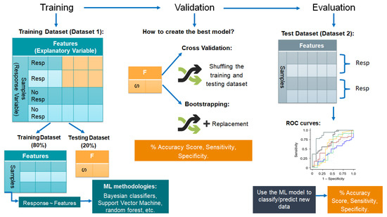 Machine learning strategies work as a flow of knowledge: the model is built by learning from sample data, known as training data, and then applies the knowledge to make predictions or classify data [126]. Three steps must be followed for good practice in machine learning application: training, in which the model uses the training dataset to create the classification model, validation, in which the performance of the model is assessed by reshuffling of the training data, and evaluation, which consists of evaluating the model using a new dataset (Figure 4).