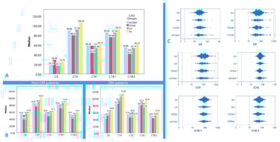 When DM history was taken into account, acylcarnitine levels were similarly affected in all CAD groups, with the only exception being C8, which was differentiated between STEMI and SA in non-DM patients (p = 0.045). Furthermore, DM patients, regardless of CAD category, did not present any discerning differences in median acylcarnitine levels as they were all similarly elevated (see Figure 1B, Table S5).