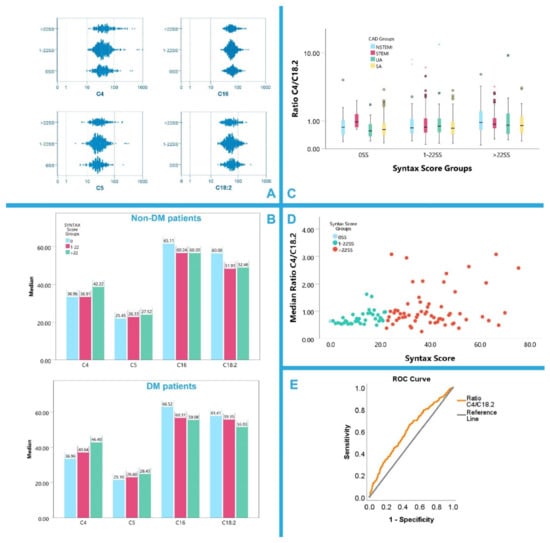 (A) SS Groups, log10 scaled 2-D plots for C4, C5, C16, and C18:2 level distributions. (B) Bar plots with the respective medians for each of the important acylcarnitines for the SS groups. (C) Log10 scaled grouped box plots with the respective medians for the C4/C18:2 carnitine ratio in each of the CAD groups for all three SS groups. (D) Linear relationship of the C4/C18:2 ratio to the continuous SS as identified by the linear regression model presented in text. (E) ROC analysis of the C4/C18:2 ratio for high risk SS Group > 22.