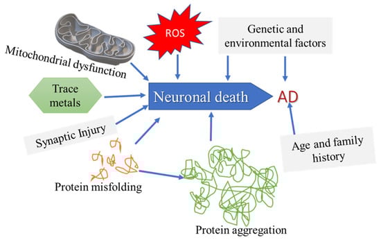 Common etiological factors that might lead to neurodegeneration. The etiological origins of neurodegenerative diseases such as AD are unknown, but the known stimulators are multifactorial, i.e., genetic, environmental, aging, and molecular. AD displays the typical characteristics associated with neurodegeneration: protein misfolding provoking protein aggregation, synaptic dysfunction, metal toxicity, mitochondrial dysfunction, and ROS.