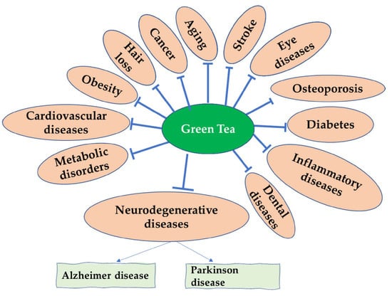 Aging alters the integrity of the brain and cognitive ability by intensifying the biomechanical force of the cerebral vasculature and changing vascular remodeling [184]. Chronic inflammation is an inducer of atherosclerosis by stimulating the vascular endothelium, elevating the adhesion of mononuclear cells to the incapacitated endothelial layer, and extravasation into the vessel wall. Green tea polyphenols may alleviate vascular endothelial dysfunction and inflammation by upregulating eNOS levels, elevating VEGF expression, and halting endoplasmic reticulum/oxidative stress. The green tea polyphenol EGCG was observed to constrain angiotensin II and TNF-α-induced hypertrophy by inhibiting ROS-promoted stress in cardiomyocytes [185]. Epidemiological studies have shown that green tea consumption causes a 5-10-fold lower incidence of PD in Asian populations [160]. The interconnectedness between the immune, cardiovascular, and nervous systems are linked to endothelial dysfunction and inflammation, which are factors involved in the pathogenesis of AD that may be alleviated by the medicinal actions of EGCG.