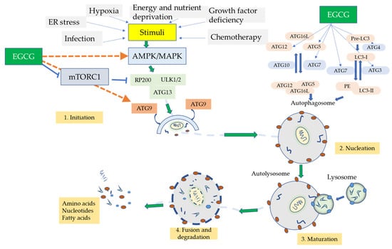 Proposed mechanism of EGCG autophagic response. Autophagy is a molecular recycling system explored extensively in cancer research. The promotion of molecular insults, i.e., ER stress, hypoxia, and chemotherapy, initiate the AMPK or MAPK/AKT/mTOR pathway, which recruits downstream effector protein kinases Unc-51 like autophagy activating kinase (ULK1/2,) and RP200 leading to the cascade of events leading to degradation of cellular debris. EGCG can act via AMPK or MTORC1 and act indirectly on autophagic-like proteins (ATG9) and ATG-9-15 to induce the autophagic series of events resulting in cellular debris breakdown and leading to the residue being reused for proper cellular growth and homeostasis.