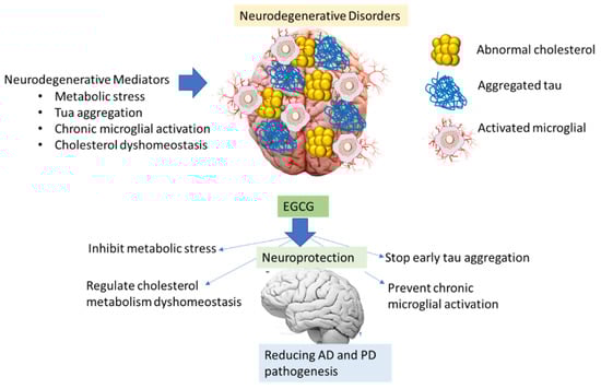Alzheimer’s and Parkinson’s diseases are the two most common forms of neurodegenerative diseases. The exact etiology of these disorders is not well known; however, environmental, molecular, and genetic influences play a major role in the pathogenesis of these diseases. Using Alzheimer’s disease (AD) as the archetype, the pathological findings include the aggregation of Amyloid Beta (Aβ) peptides, mitochondrial dysfunction, synaptic degradation caused by inflammation, elevated reactive oxygen species (ROS), and cerebrovascular dysregulation. This review highlights the neuroinflammatory and neuroprotective role of epigallocatechin-3-gallate (EGCG): the medicinal component of green tea, a known nutraceutical that has shown promise in modulating AD progression due to its antioxidant, anti-inflammatory, and anti-aging abilities. This report also re-examines the current literature and provides innovative approaches for EGCG to be used as a preventive measure to alleviate AD and other neurodegenerative disorders.