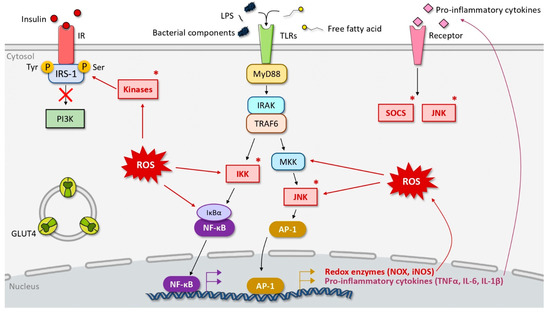 Oxidative stress exerts a deleterious impact on glycemic control by impairing glucose uptake. Cellular models of insulin resistance are characterized by elevated ROS levels, and treatment with antioxidant species improves insulin resistance [59]. Indeed, during oxidative stress, high intracellular ROS levels activate NF-κB, JNK and mitogen-activated protein kinase (MAPK) pathways [44] (Figure 2). As described above, the involvement of these pathways results in the activation of the serine kinases JNK1 and IKKβ, which impair insulin signaling pathways by serine-phosphorylation of IRS-1 [47]. Concomitantly, the activation of such pro-inflammatory signaling pathways enhances the secretion of pro-inflammatory cytokines such as TNF-α, IL-6 and IL-1β, which in turn contribute to altered insulin signaling (Figure 2). In parallel, the expression of genes coding for ROS-producing enzymes such as NOX and inducible nitric oxide synthase (iNOS) is induced by the pro-inflammatory NF-κB/AP-1 pathway (Figure 2). Excessive ROS react with other cellular components such as proteins, lipids and DNA, damaging molecular structures and cellular functions [55]. In particular, ROS can cause lipid peroxidation, leading to damaged cellular membranes and circulating lipoproteins. These reactive species can also damage proteins, inducing conformational modifications and loss or impairment of function/enzymatic activity, and damage DNA, possibly leading to mutagenesis. These damages contribute to cellular dysfunctions. Importantly, there is real crosstalk between inflammation and oxidative stress since excessive ROS levels promote the secretion of various pro-inflammatory cytokines that induce oxidative stress [59]. Both mechanisms maintain each other, and their synergistic action may contribute to insulin resistance onset and aggravation.